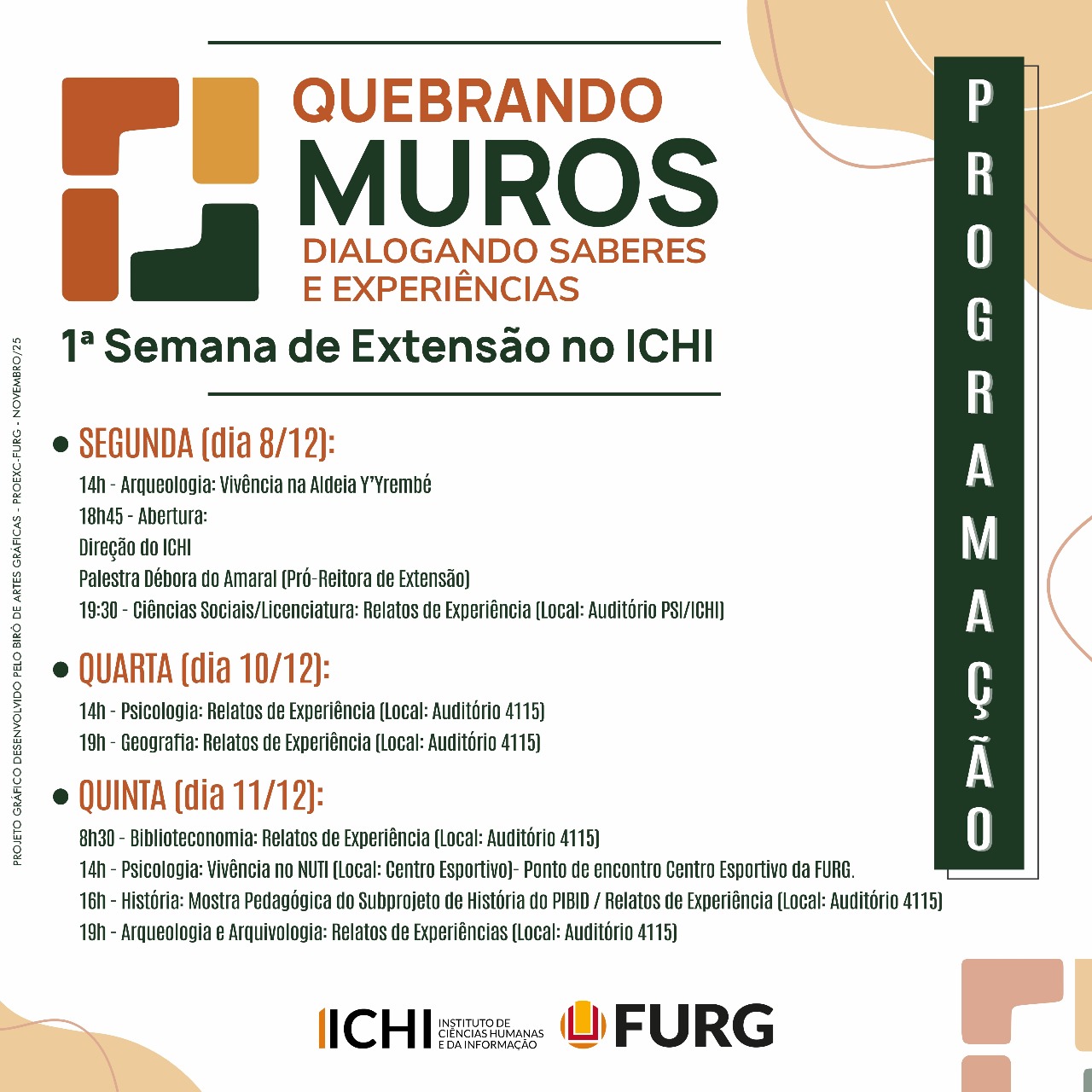 A 1ª Semana de Extensão do ICHI nasce como uma construção coletiva dos cursos do Campus Carreiros — Arqueologia, Arquivologia, Biblioteconomia, Ciências Sociais, Geografia, História e Psicologia. Este movimento surge de forma espontânea e comprometida, buscando afirmar três necessidades centrais: